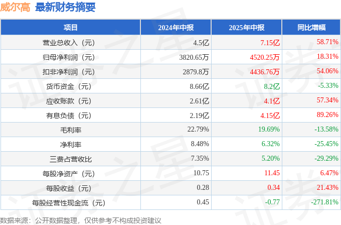 据证券之星公开数据整理,近期威尔高(301251)发布2025年中报。截至本报告期末,公司营业总收入7.15亿元,同比上升58.71%,归母净利润4520.25万元,同比上升18.31%。按单季度数据看,第二季度营业总收入4.05亿元,同比上升64.66%,第二季度归母净利润2288.67万元,同比上升32.1%。本报告期威尔高应收账款上升,应收账款同比增幅达57.34%。