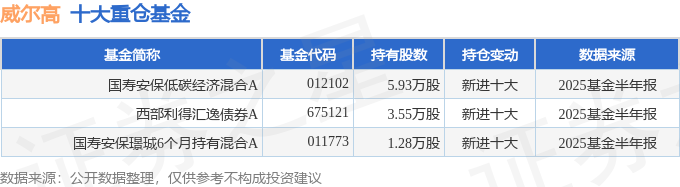 持有威尔高最多的基金为国寿安保低碳经济混合A,目前规模为0.72亿元,最新净值0.885(8月26日),较上一交易日下跌1.7%,近一年上涨69.9%。该基金现任基金经理为姜绍政。